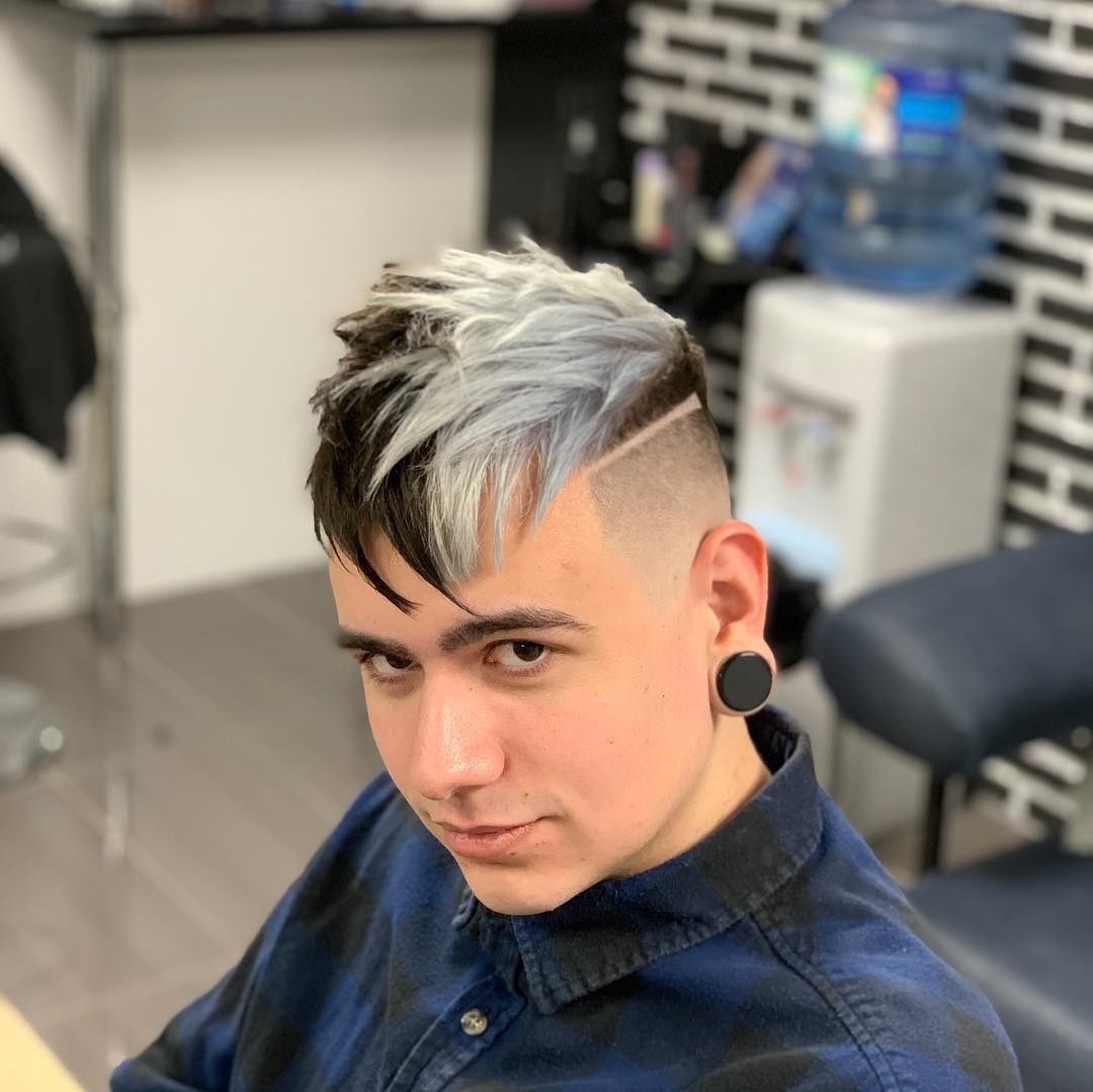 Это трендовый вариант мужской стрижки. Макушка остается с длинными прядями, а виски и затылок стригутся почти под ноль. Резкий переход длины особо заметен у брюнетов. Чтобы блондинам усилить резкость перехода, только макушку или отдельные пряди красят в темный цвет.