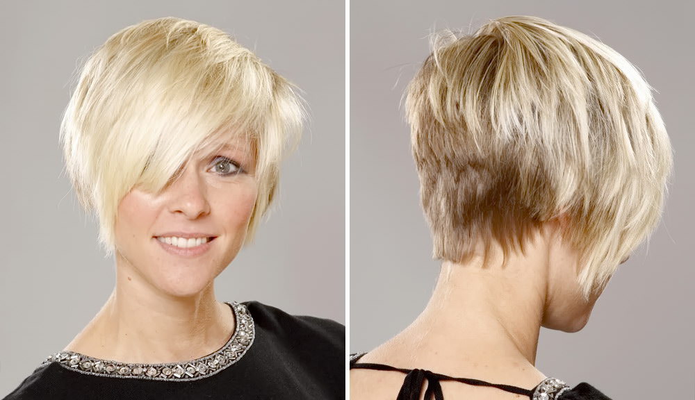 Каскадная техника прекрасно подходит для придания объёмности коротким локонам, причём как явная «шапка» они выглядеть не будут. Хороший вариант – сделать асимметричную укладку, выполнив градуировку по всему периметру, но с разной длиной по двум сторонам.