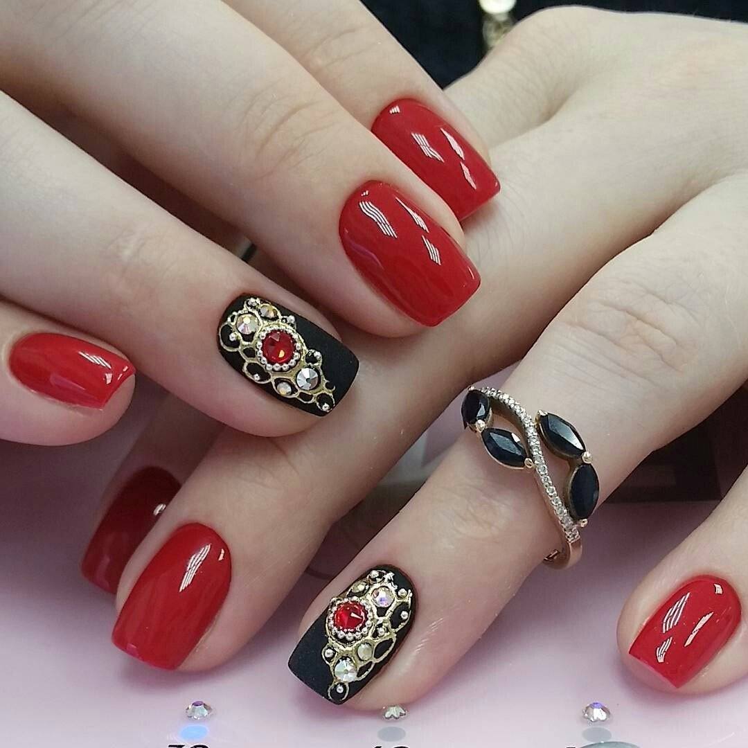 Как уже было сказано выше, очень красиво смотрится красный цвет. К красному цвету можно добавить золотистый или коричневый. Такой маникюр придаёт своей обладательнице некий шарм и роскошь.