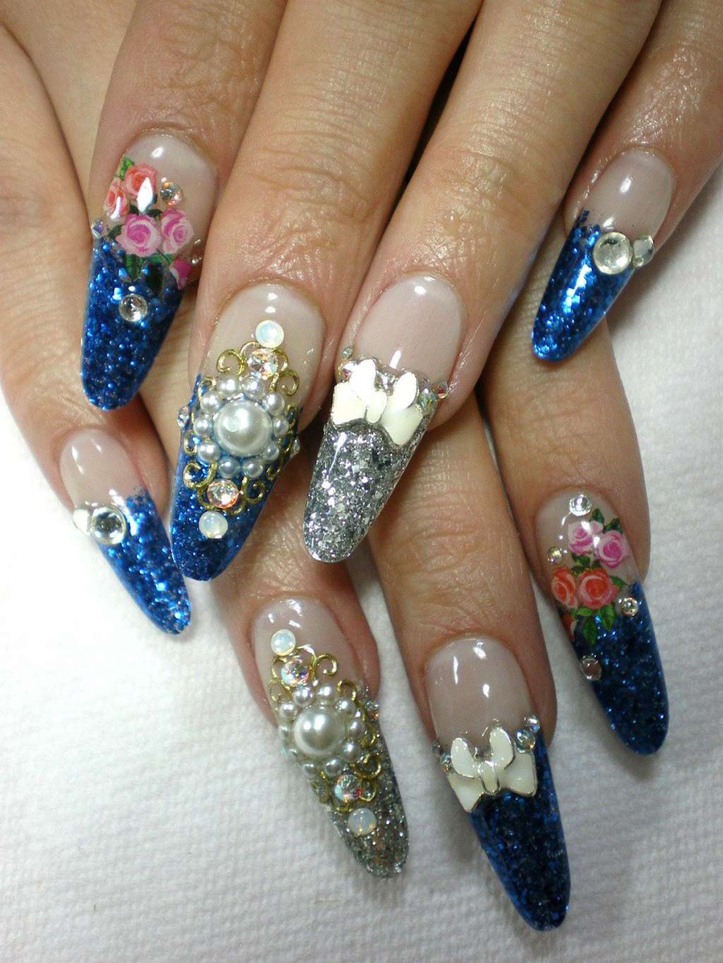 А минерал выполняется путем смешивания витражных красок и геля. Данные компоненты наносятся на основу из фольги. Форма чаще всего делается более продолговатой, что делает пальцы более изящными и удлиненными.