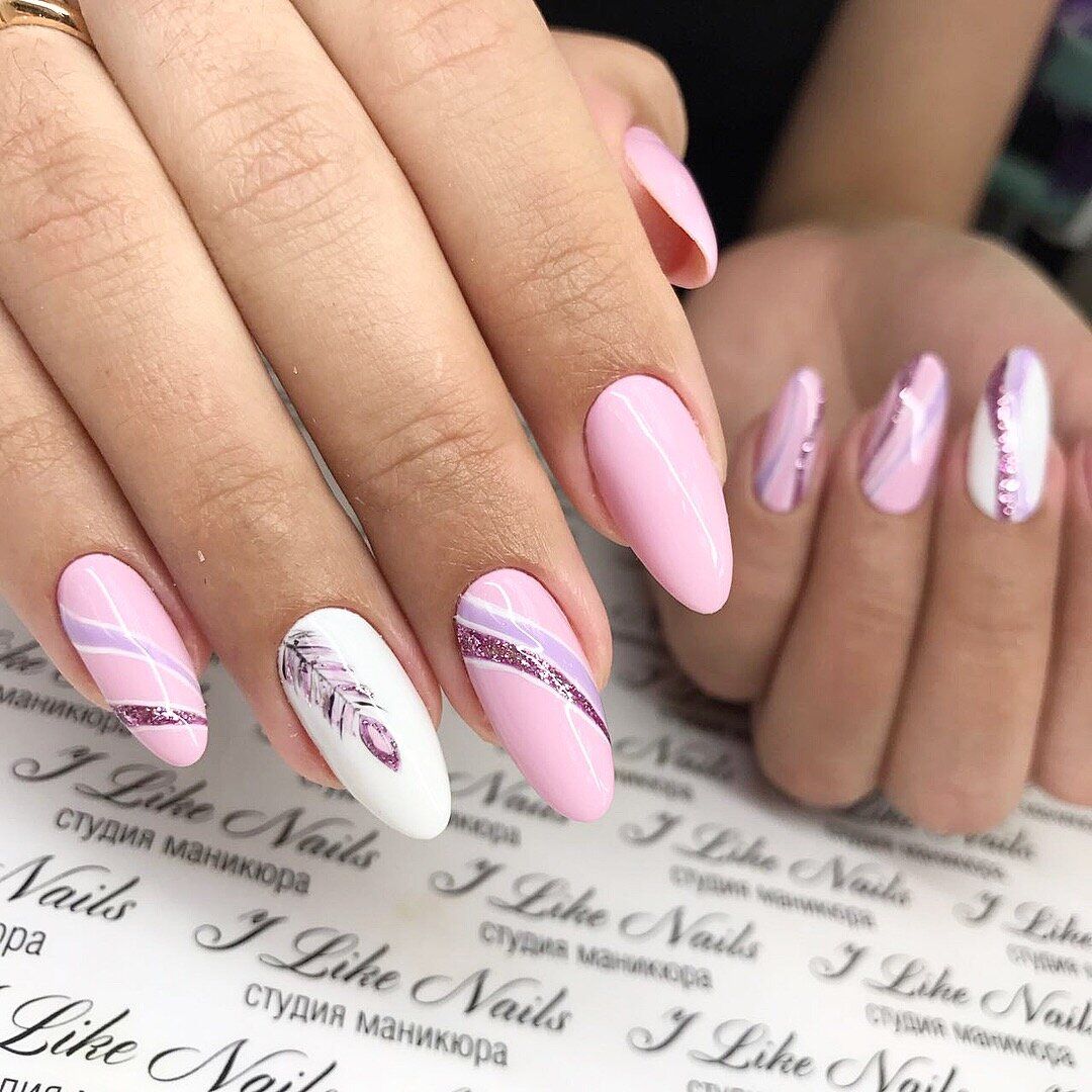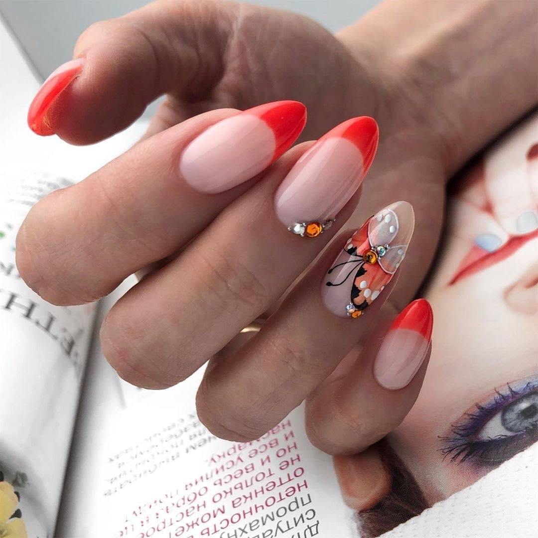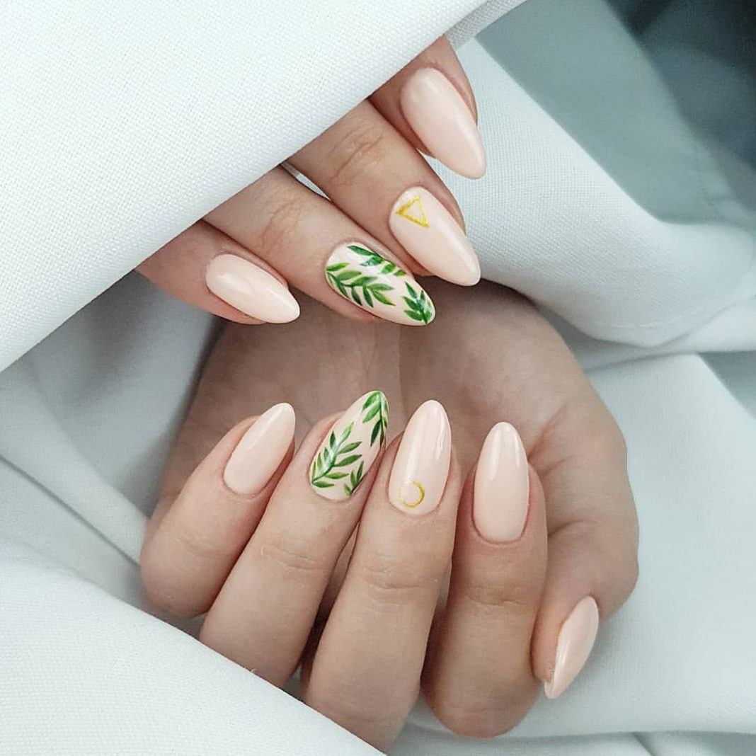 Модный маникюр с декором на миндальные ногти лето 2020