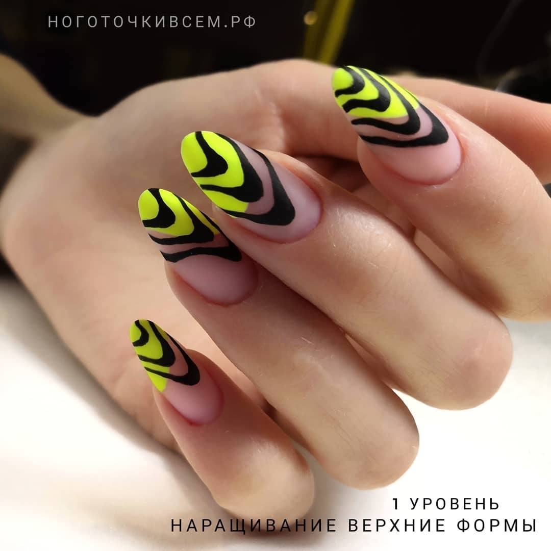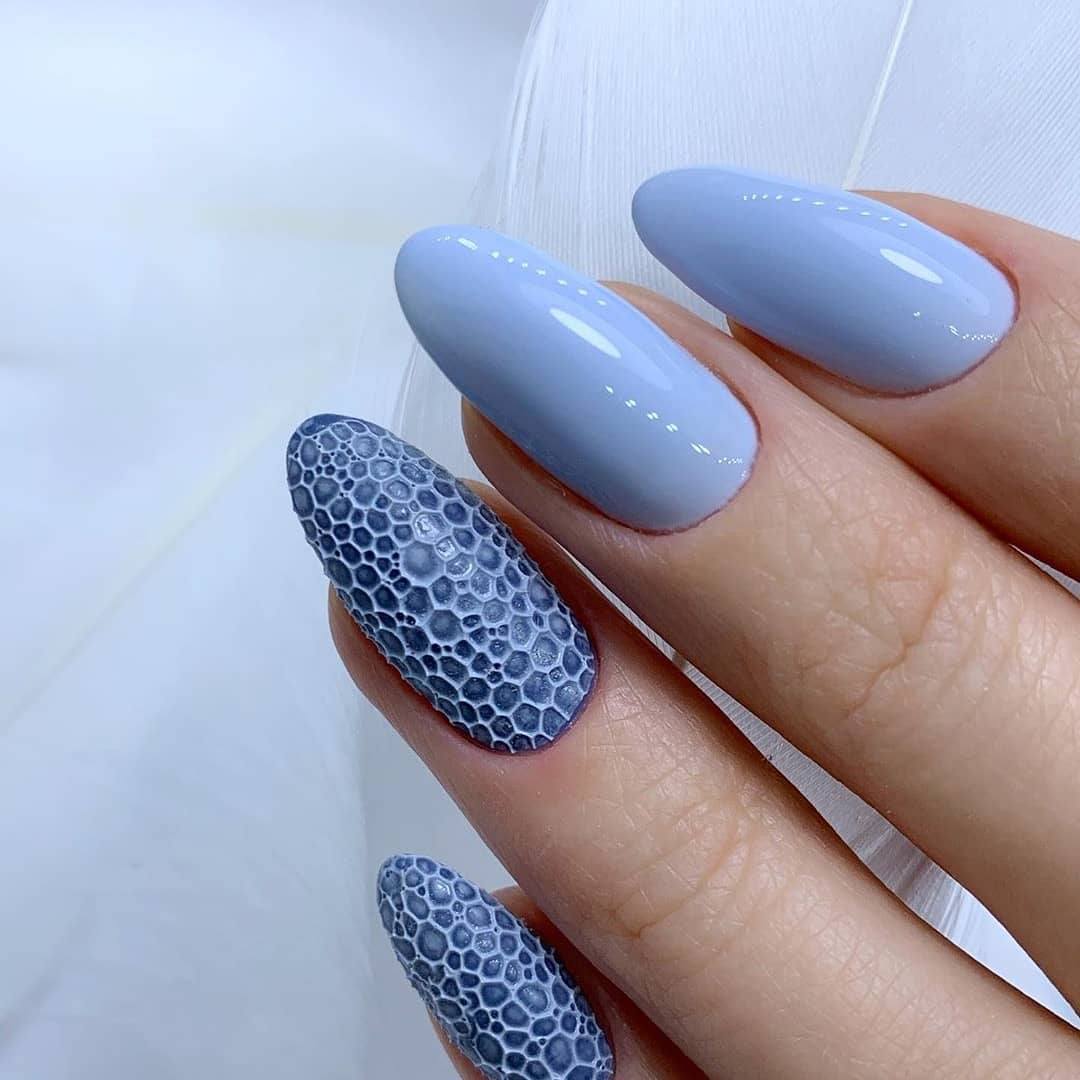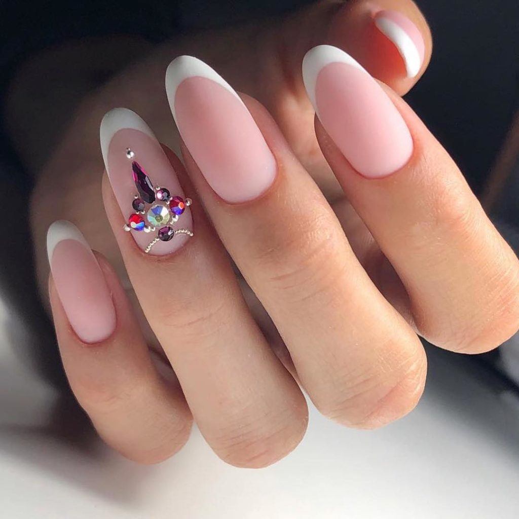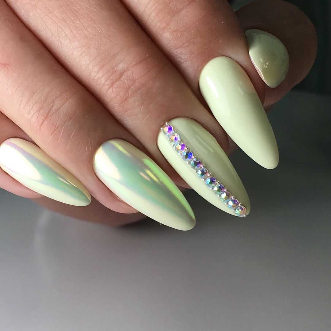 Модный маникюр с декором на миндальные ногти лето 2020