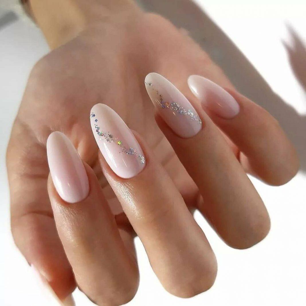 Блестки шикарно сочетаются с белым лаком, в 2020-2021 году вы можете использовать как классические цвета блесток — золотистые и серебристые, так и разноцветные варианты, которые будут не менее красиво смотреться на ноготках.