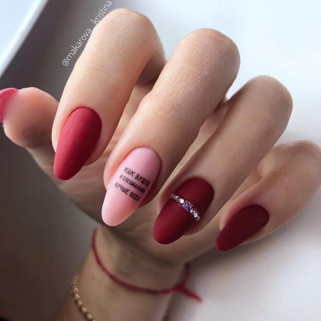 Матовая фактура великолепно сочетается с французским новомодным маникюром. В этом случае рекомендуется сделать акцент на один пальчик, который следует выполнить в графическом формате.
