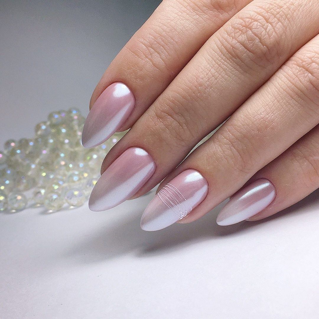 Использование втирки в дизайн белого маникюра на коротких и длинных ногтях дает прекрасную возможность создать невероятно нежный легкий дизайн, который выглядит идеально. Белый фон очень красиво дополняется жемчужным сиянием. Втирка настолько выглядит идеально и самодостаточно, что не требует какого-то дополнительного декора.