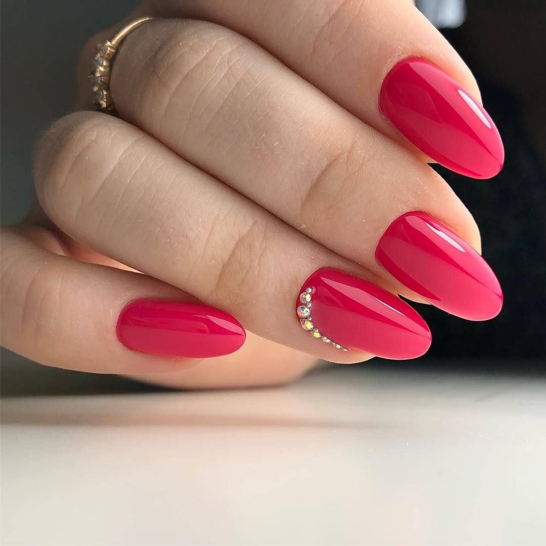 Современный маникюр на миндальные ногти вовсе не обязательно должен быть выполнен с дизайном. Все чаще девушки выбирают для себя сдержанное однотонное покрытие и украшают его декором. В зависимости от вида и количества деталей маникюр может смотреться совершенно по-разному.