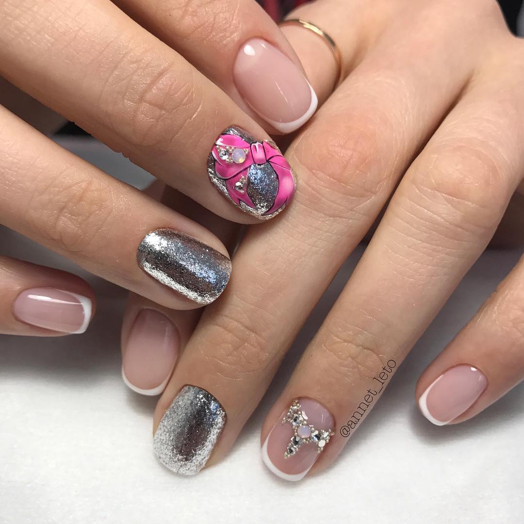 В этом Новогоднем сезоне французский маникюр тоже должен сиять и блестеть. Поэтому, френч нужно украшать фольгой, блестками и стразами.