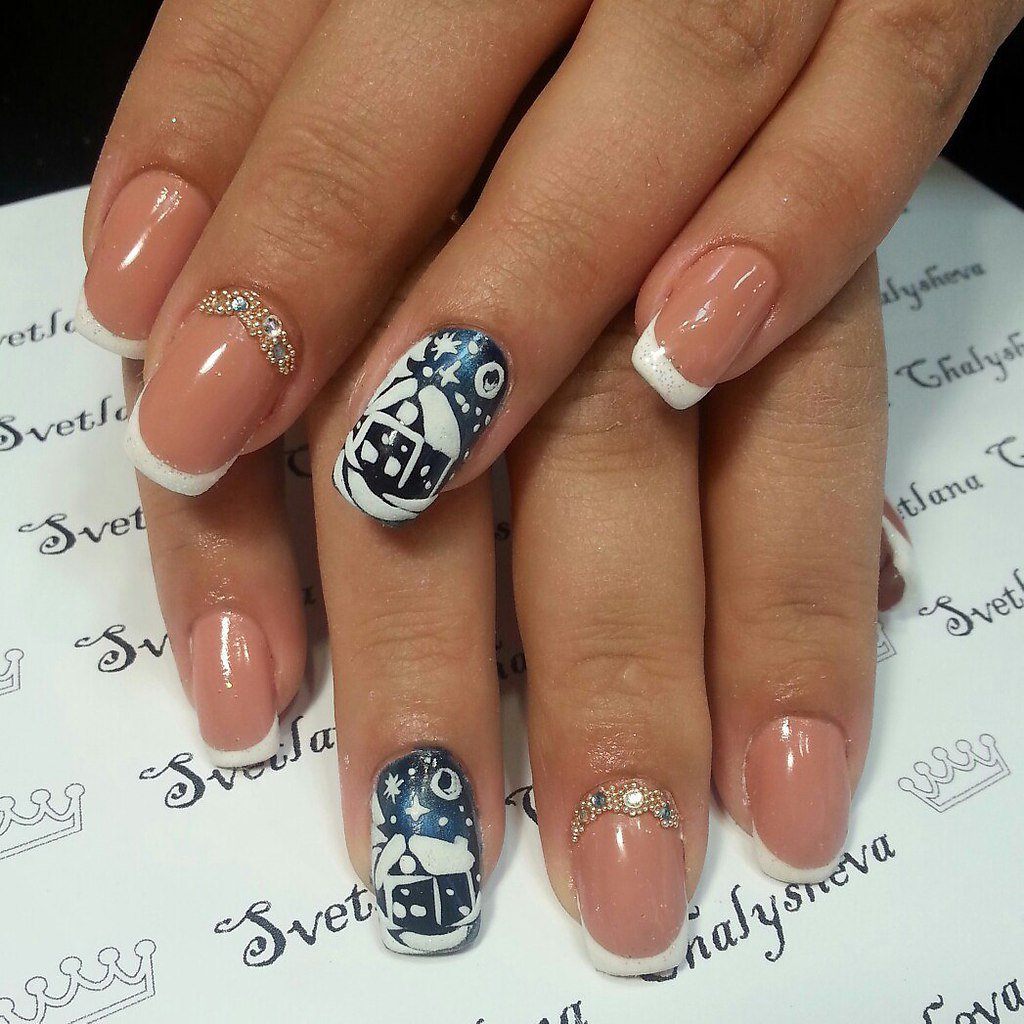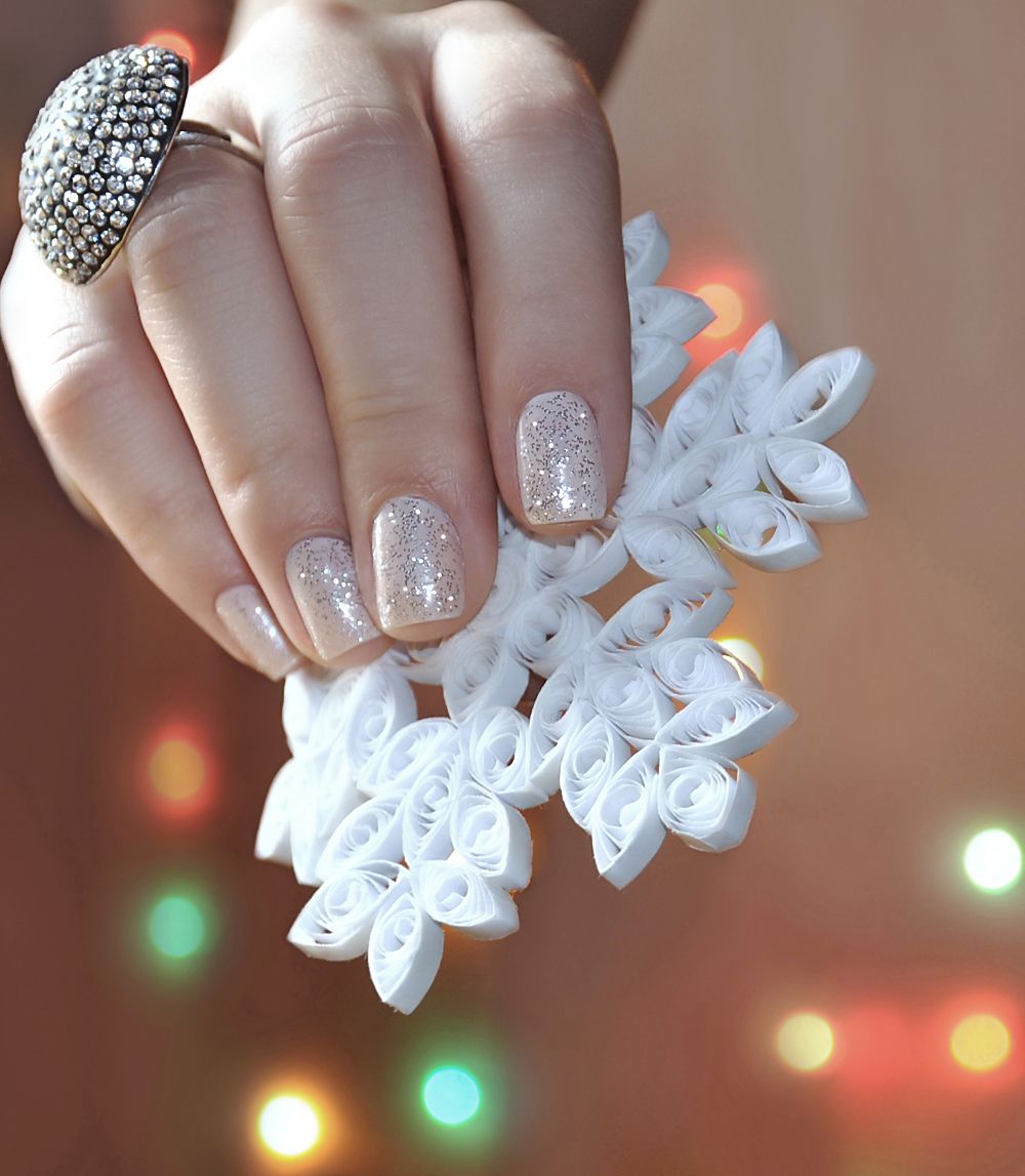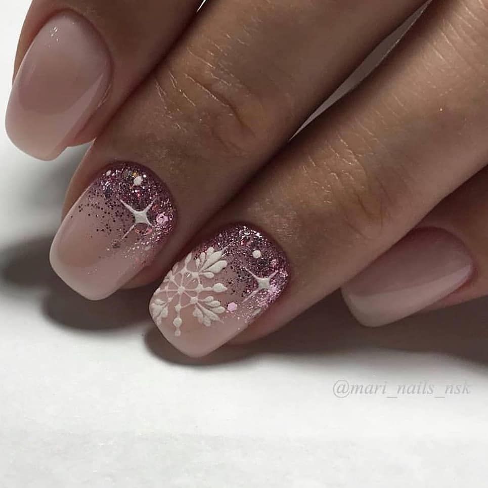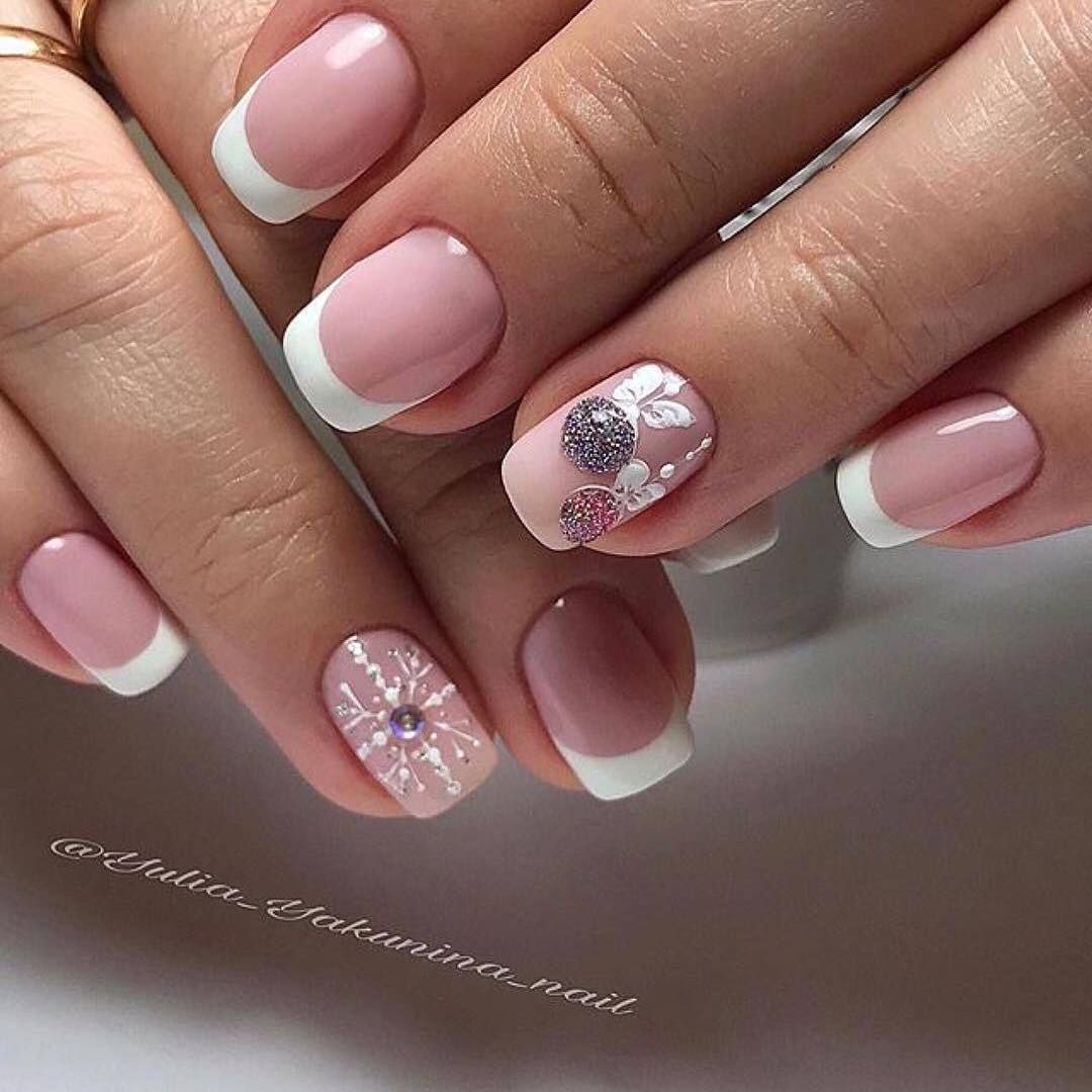 Нежно и модно смотрится классический белый нежный френч в сочетании с блестками и снежинками.