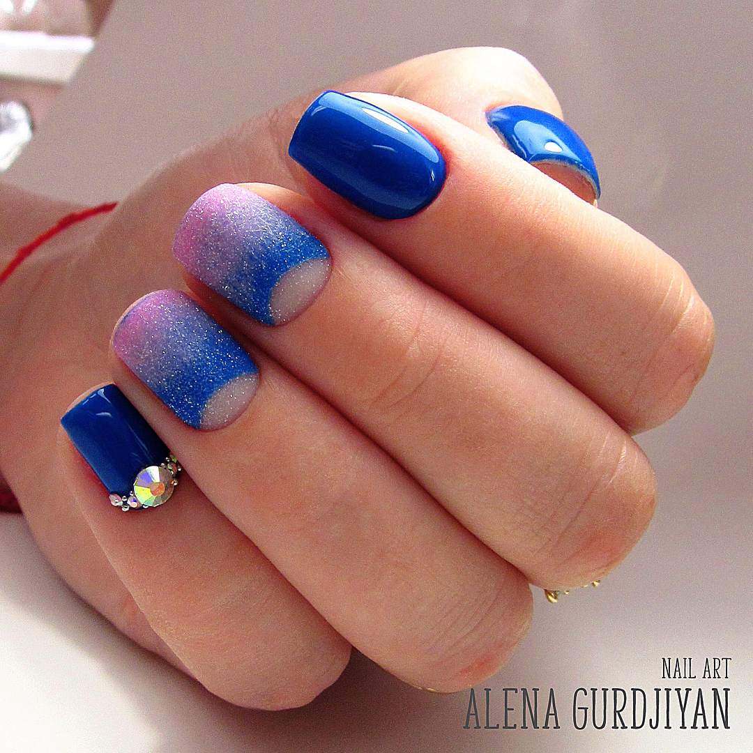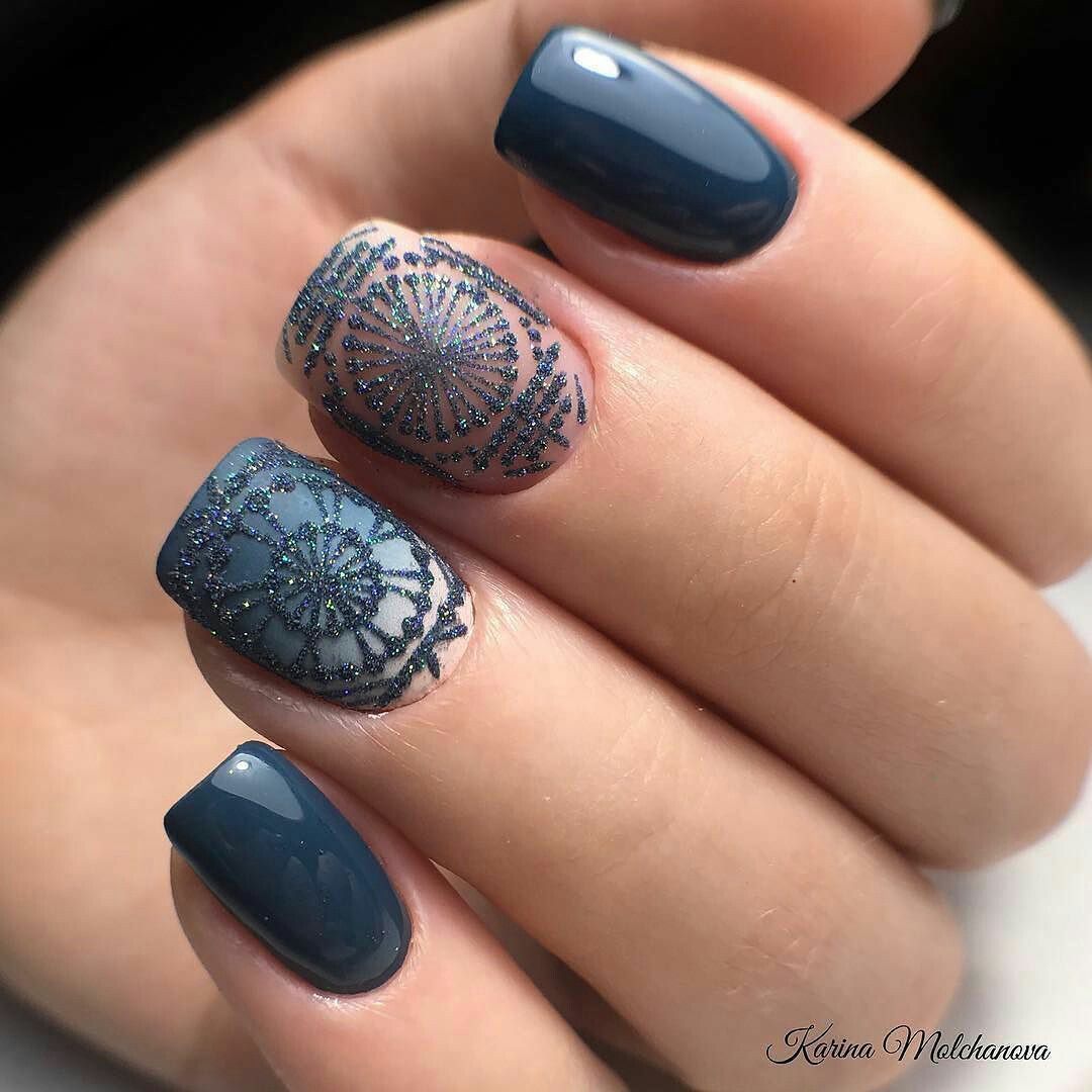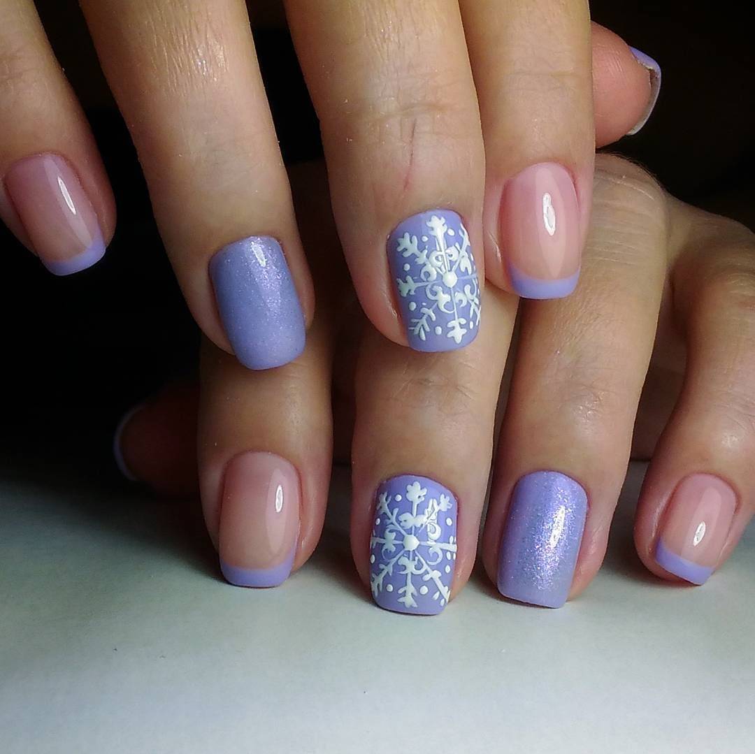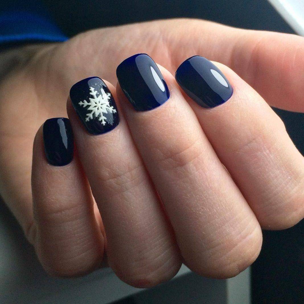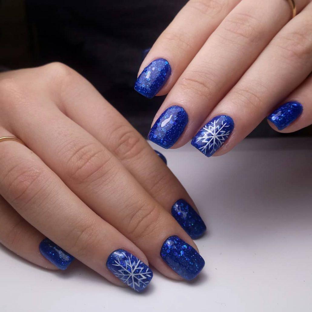 Синий цвет будет отлично смотреться в новогоднем маникюре, если вам нужно вписаться в холодный, бодрящий сезон зимы. Актуальным будет французский маникюр в синем цвете, дизайн омбре, негативное пространство, рисунки снежинок и других новогодних атрибутов.