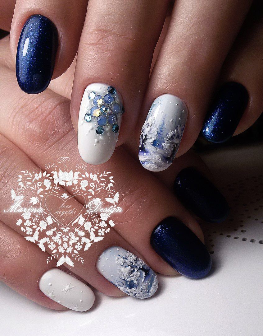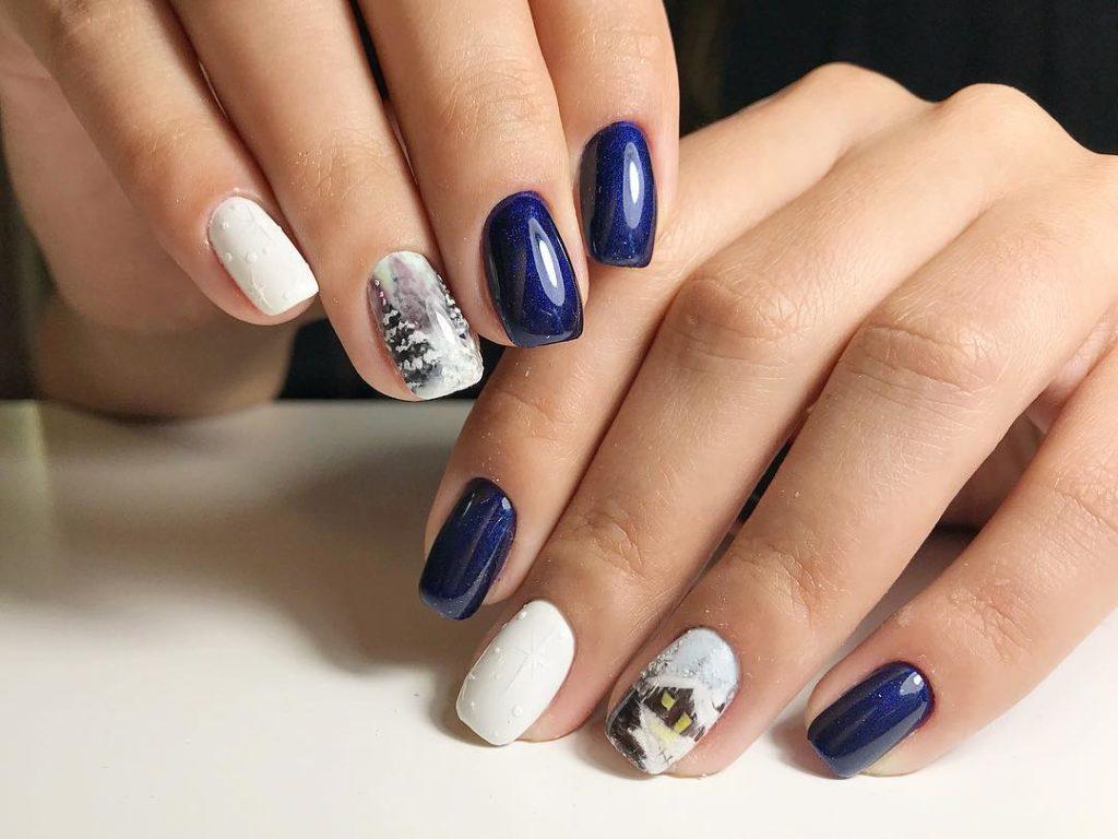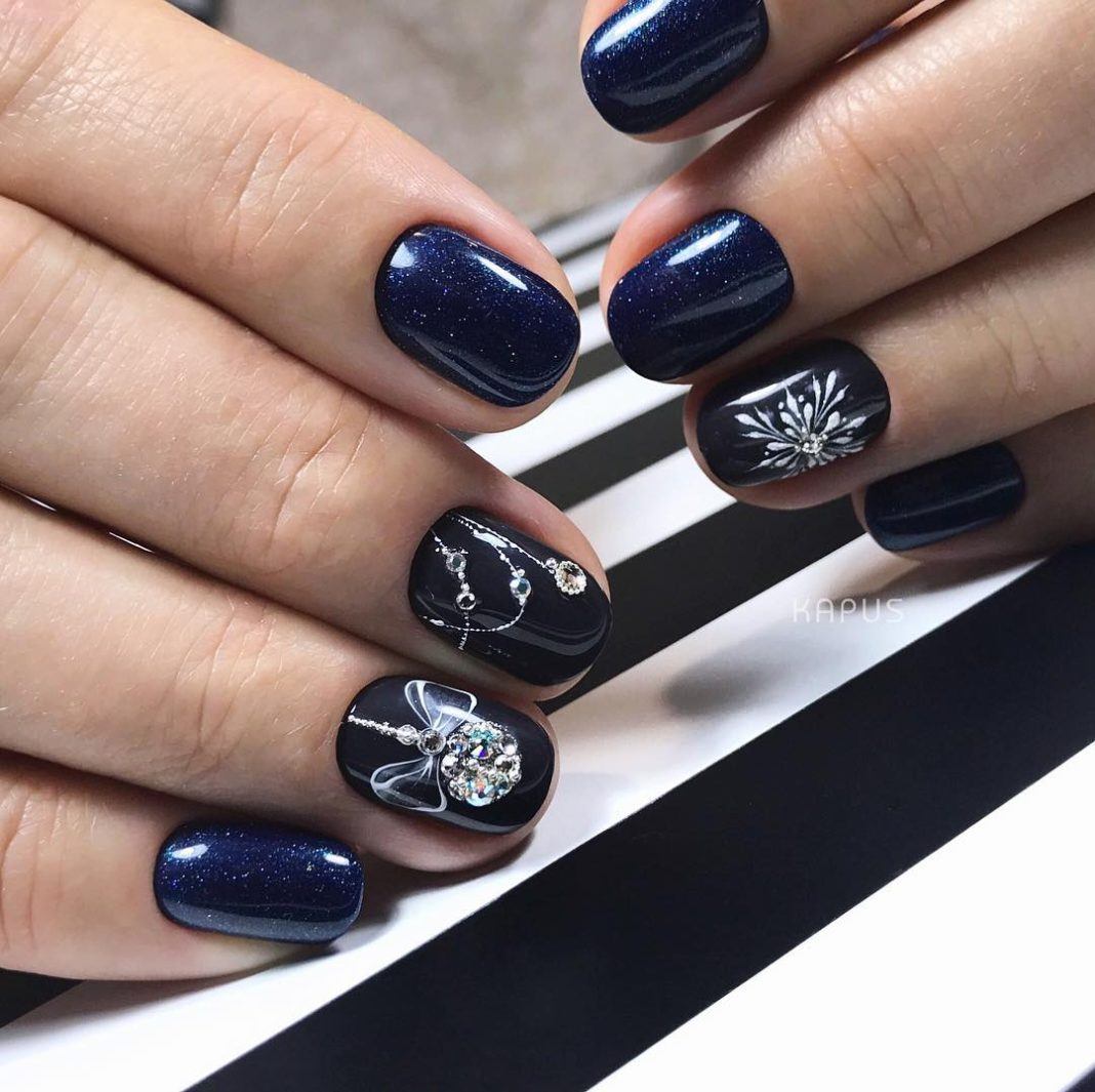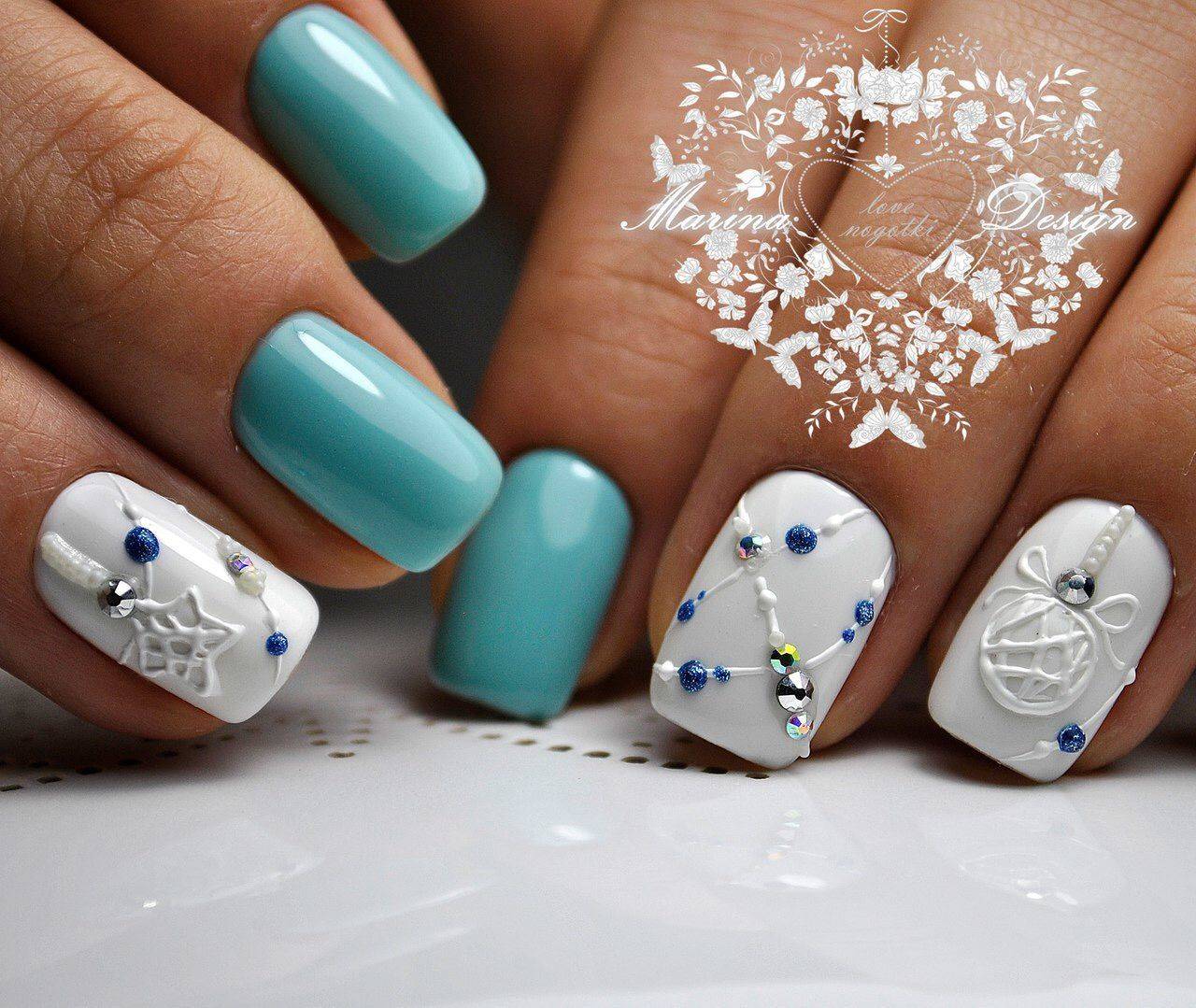 Отличный способ выделиться своим новогодним маникюром – выбрать голубой или синий цвет для фона. Яркие тона этих цветов хорошо сочетаются со спокойными оттенками: белыми, черными, серебристыми и т.д. Темный синий или насыщенный голубой могут сочетаться с любыми цветами, которые нужны для создания задуманного новогоднего дизайна.