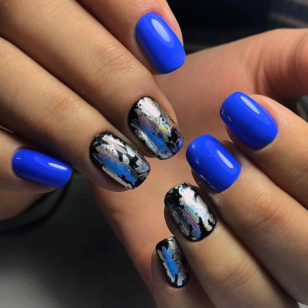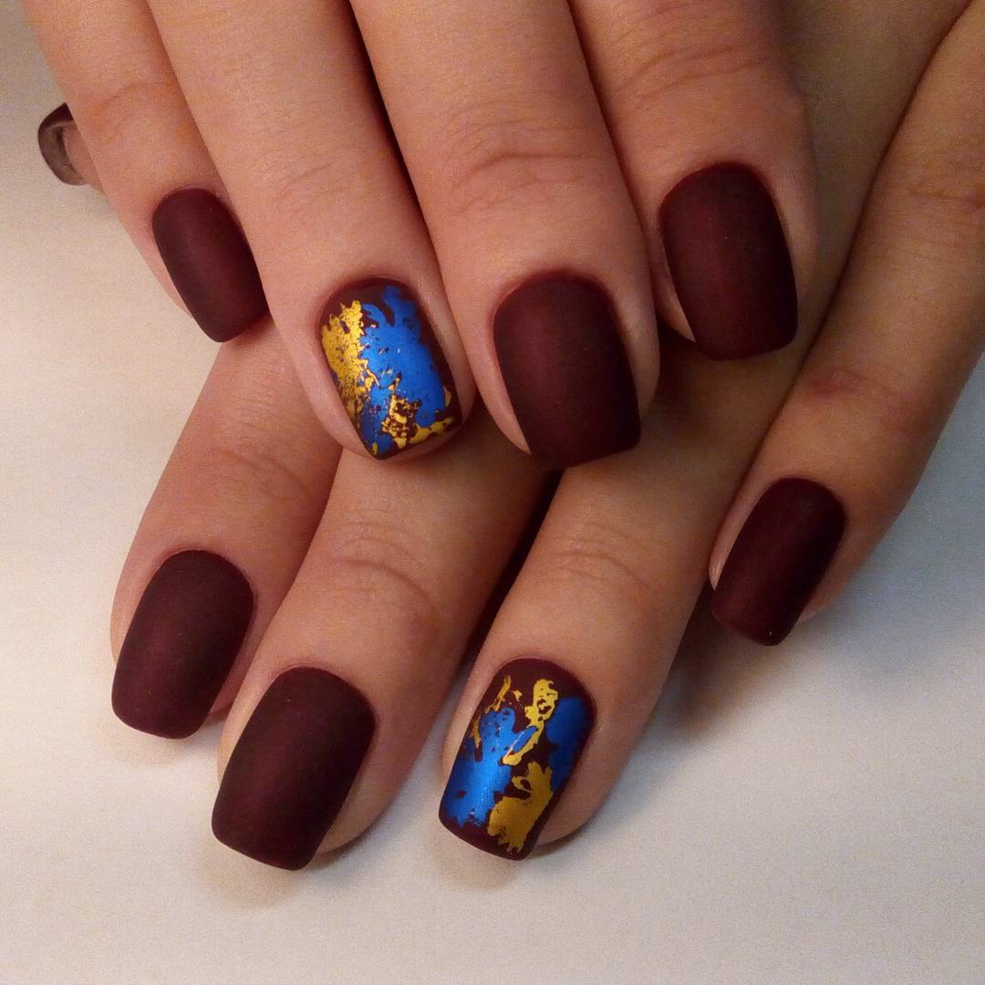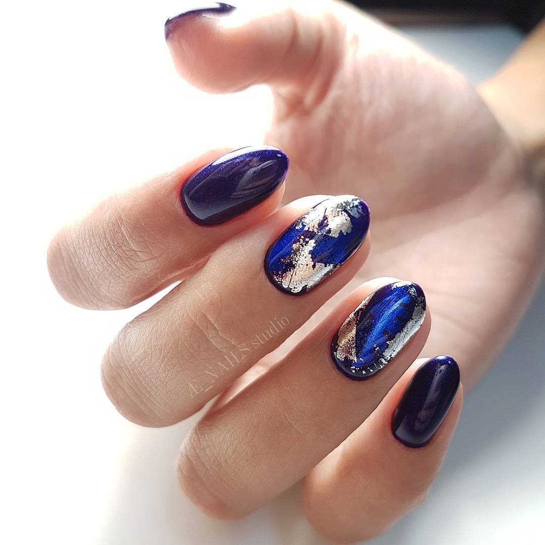 Не стоит расстраиваться любительницам более яркого оформления ногтей. Ведь такая цветовая гамма просто незаменима для образа на вечеринку или праздничное мероприятие. Отлично смотрится маникюр в синем, бордовом, коричневом или красном цвете. Особенно, если дополнить его россыпью блесток, страз или другого декора. Что касается текстуры покрытия, то в 2020 году уместным будет как глянцевый, так и матовый маникюр. Весьма интересно смотрится оформление «жидкой фольгой», которое всегда выглядит достаточно ярко и смело. Также отлично смотрится оформление с помощью дополнительных деталей. Это могут быть стразы, втирка, блестки, глиттер и другой декор. Каждый из них дает совершенно разный эффект, поэтому перед выбором обязательно посмотрите несколько примеров.