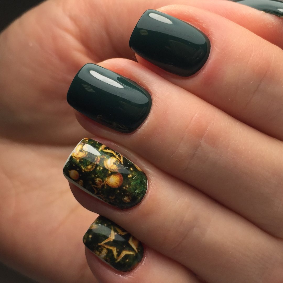 В тематике Нового года, зеленый цвет ассоциируется с пушистой елкой, которую так и хочется нарисовать на ноготках. Но не елкой единой хорош зеленый в маникюре. Темные оттенки уже давно в тренде, а особенно в матовом исполнении. На таком фоне можно изобразить что угодно, а выбор цвета не имеет границ.