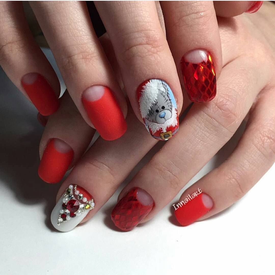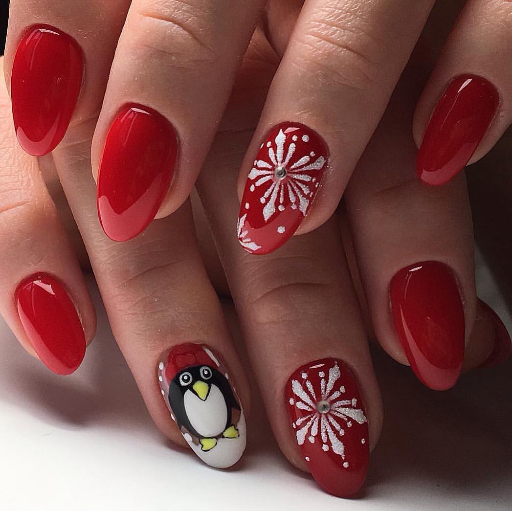 Красный маникюр великолепен круглый год, но на новогодние праздники это один из самых великолепных цветов для дизайна ногтей: красные ногти с белыми снежинками и красные ногти с рисунком Санты или оленей — это все классика, которая будет актуальной каждый сезон в маникюре.