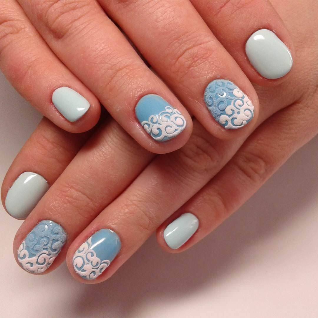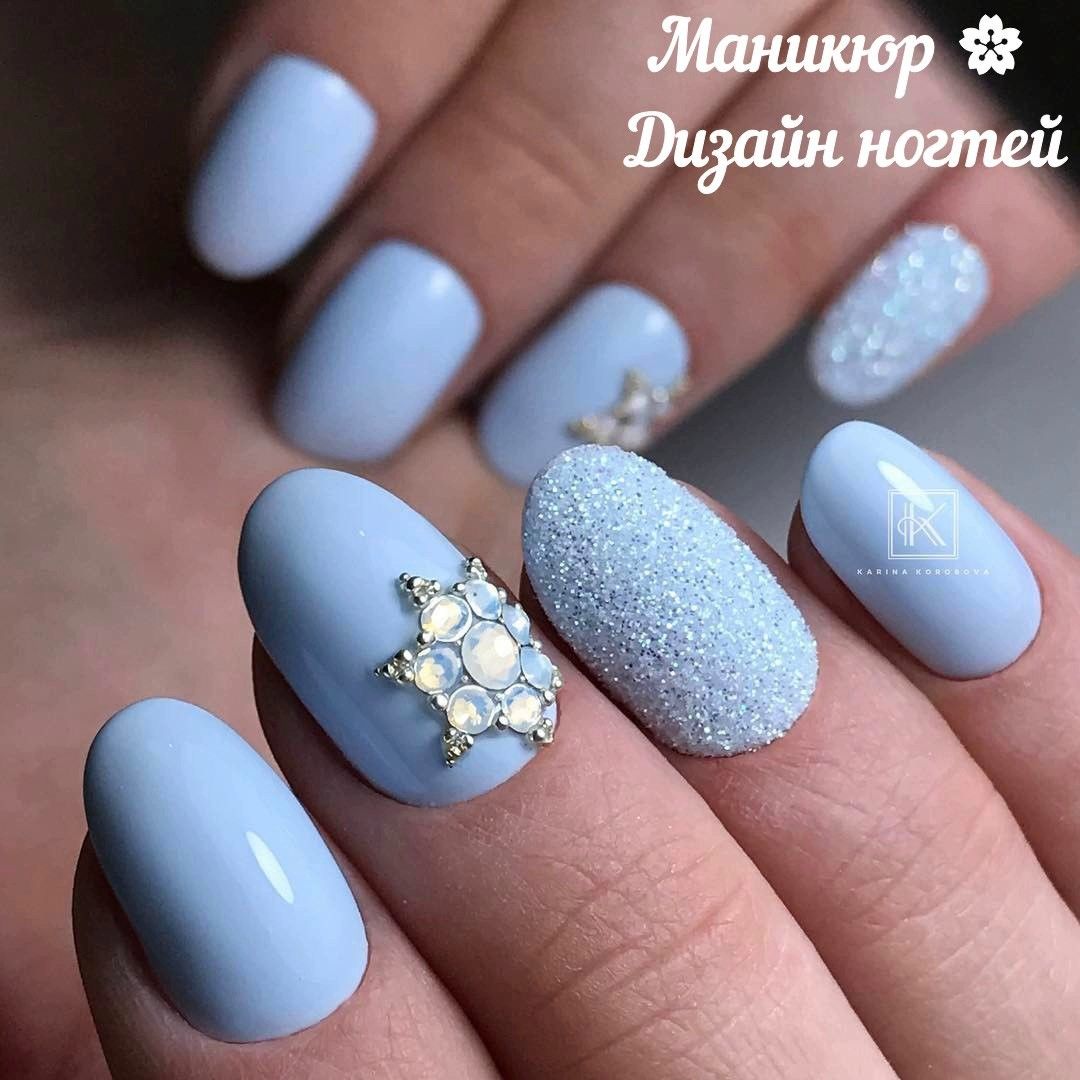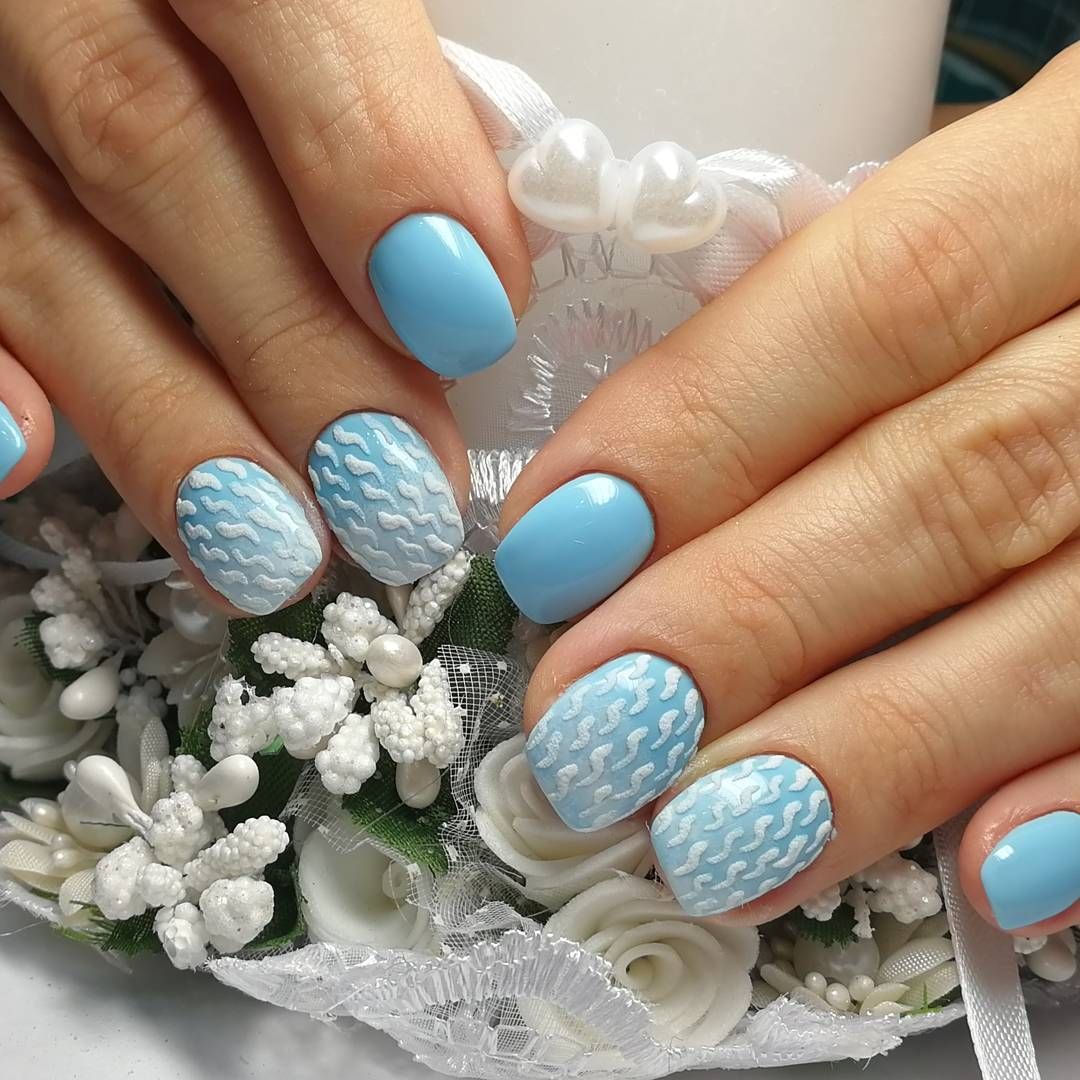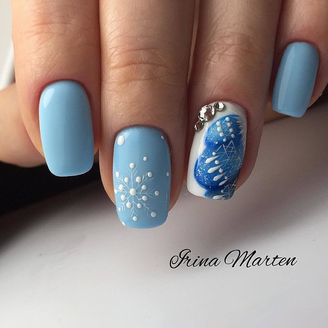 - голубой – легкий и универсальный цвет, который часто используется для выполнения зимнего тематического маникюра с елочками, снежинками, варежками, мишками Тедди