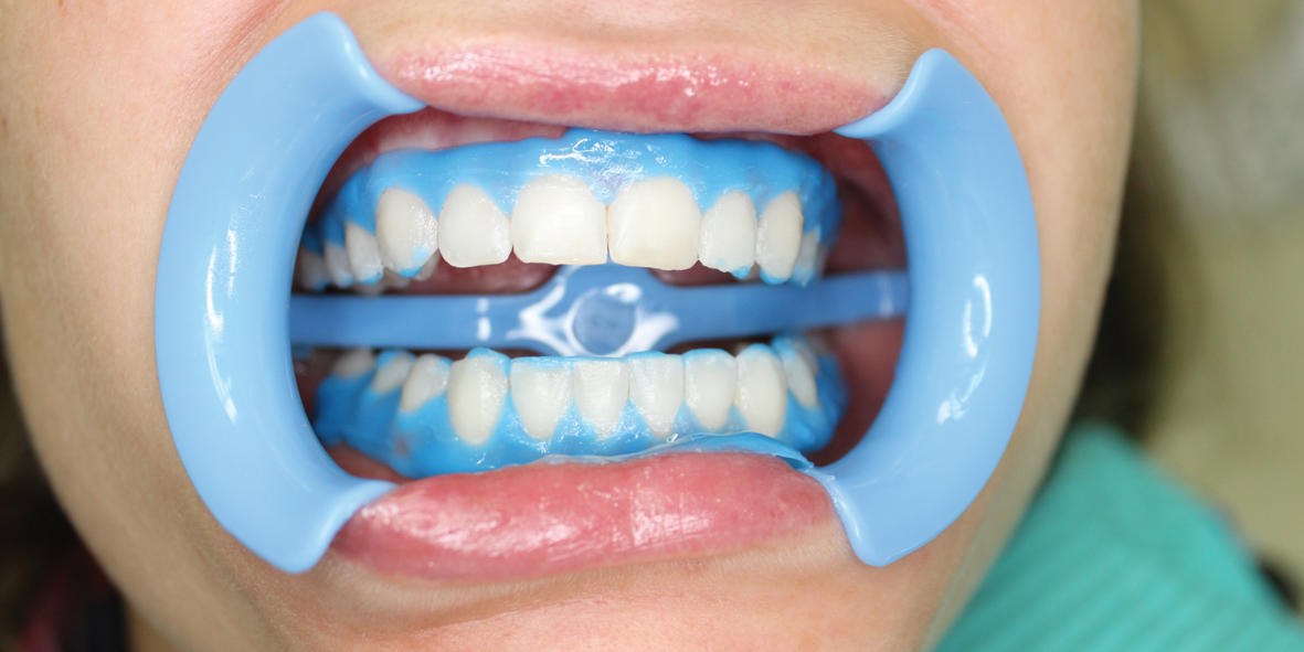 1. Стоматолог распределяет гель, который содержит или пероксид водорода, или карбамида. На активное вещество приходится 30%.